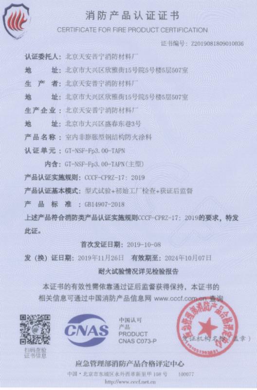GT-NSF-TAPN室內(nèi)厚型鋼結(jié)構(gòu)防火涂料是我廠開(kāi)發(fā)出的最新產(chǎn)品,它取代了以前厚型鋼結(jié)構(gòu)防火涂料雙組份的施工工藝,使施工工藝變得更加簡(jiǎn)單易行,而且附著力強(qiáng),耐火隔熱性能好,33mm的涂層厚度耐火極限可以達(dá)到3個(gè)小時(shí)。 產(chǎn)品組成: 膨脹蛭石、高強(qiáng)度粘結(jié)劑、阻燃纖維、耐高溫材料、隔熱材料助干劑等復(fù)合原料制作而成,不含石棉、甲醛及苯類(lèi)等揮發(fā)性有害物質(zhì)。